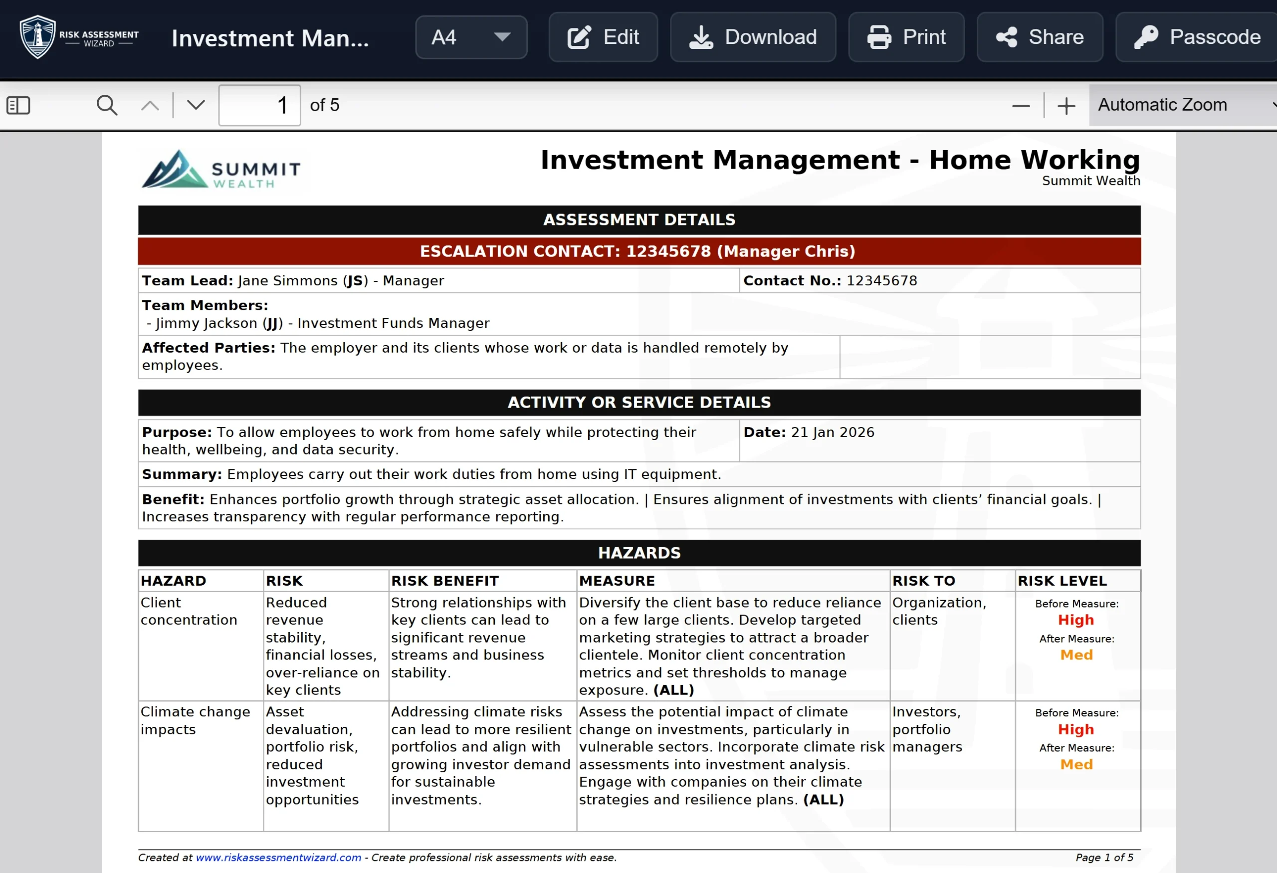 Create a professional financial services risk assessment covering everything from accounting services and mortgage brokerage to wealth management. Start with tailored hazards, controls, and benefits built for real-world financial services settings.